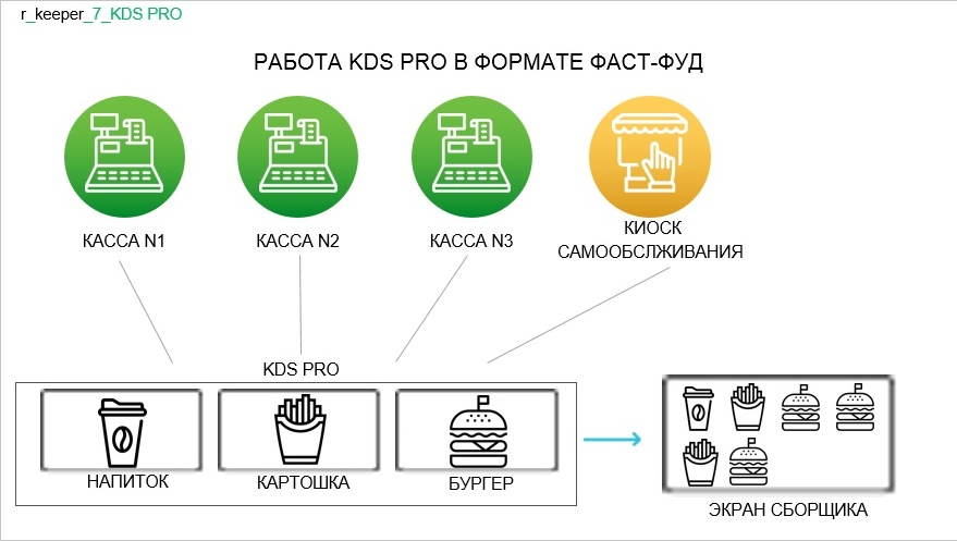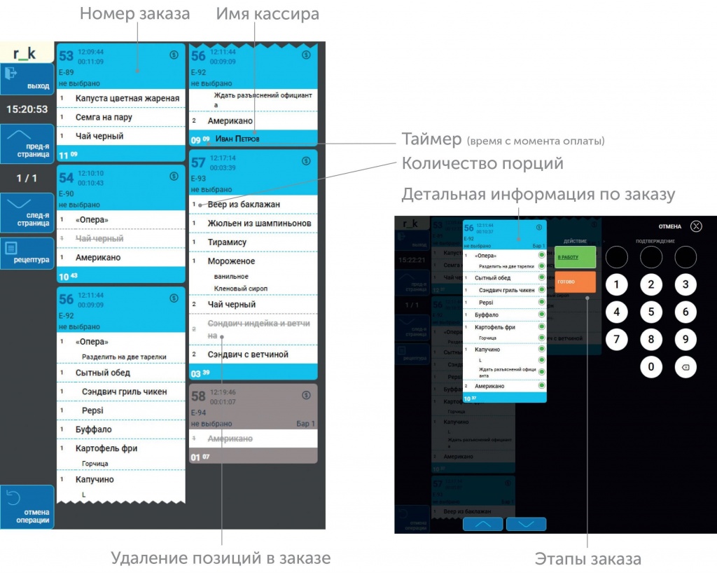 - Вывод информации о заказанных блюдах на экраны кухни, бара и других отделов производства ресторана;